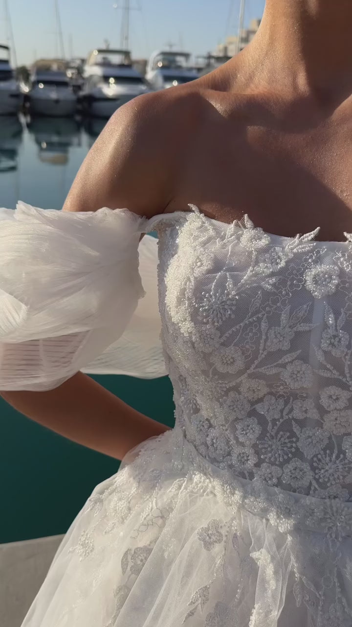 Turn heads in the ALEXIA Dress — a bold and romantic bridal statement.Crafted for confident brides who love both elegance and edge, this off-shoulder stunner features voluminous puff sleeves, a fitted lace bodice, and a dramatic detachable tulle overskirt that flows with every step. The modern mini silhouette paired with ethereal textures creates a fashion-forward look perfect for seaside vows, sunset receptions, or glamorous city weddings.