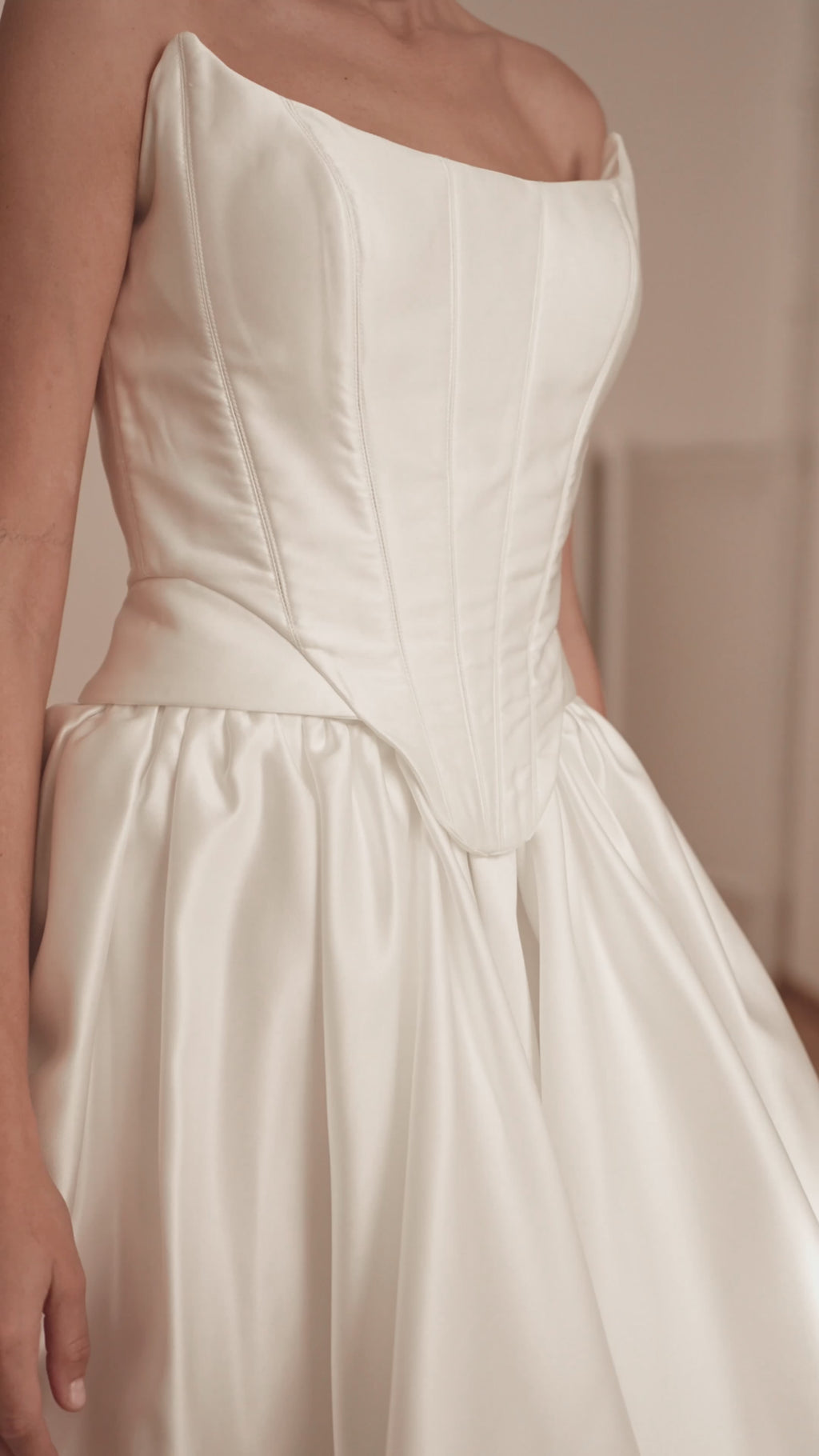 Modern minimalism meets timeless grace in the BLOSSOM Dress.This strapless mini gown features a sculpted corset-style bodice and a voluminous pleated skirt that creates a refined silhouette without excess. With its architectural neckline and clean lines, BLOSSOM is the perfect second look for a wedding day, or a chic choice for a civil ceremony, bridal shower, or rehearsal dinner.