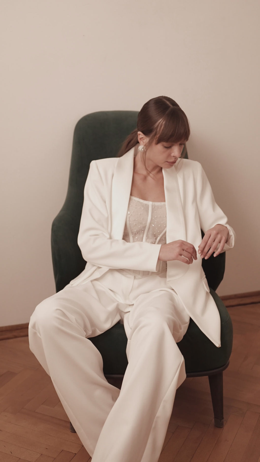 KENZO — where bridal elegance meets empowered tailoring.This sleek ivory suit set includes a structured blazer, high-waisted trousers, and a sparkling sequin corset that adds a touch of glamour to modern minimalism. Designed for confident brides, fashion-forward ceremonies, and unforgettable bridal moments — Kenzo is perfect for a civil wedding, engagement party, rehearsal dinner, or your bridal afterparty.